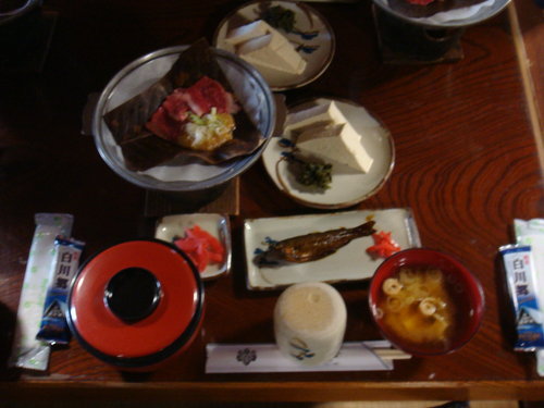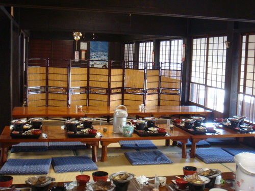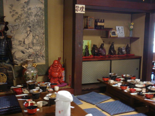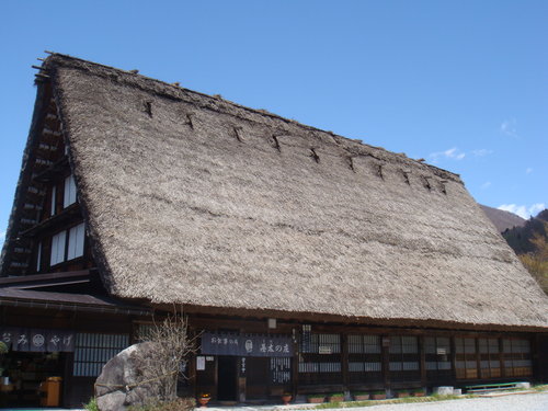 這間就是我们用餐的地方 還以為所謂合掌屋不過就是農舍 就為了怕冬雪壓垮屋頂 就把屋頂蓋成略微斜陡 鄉下地方嘛 就就地取材 利用稻草囉