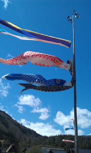今天的天氣晴朗 五月五的鯉魚旗隨風飄揚 路邊溝渠的水清澈見底 魚兒悠遊其中 置身其中 只有平靜 悠閒 難怪雅子說這裡是世外桃源 真的 都市裡車水馬龍 步調就是快 趕 急 可是到了這裡卻是靜 慢 緩