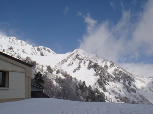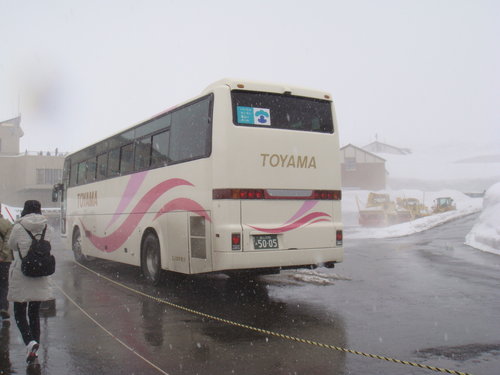 雖然早上一大早出門 不過今天算很幸運了 山下陽光普照 到了立山用餐時 吃著冷冷的食物 搭著熱飯熱湯時(山上運送不易 只能吃冷食搭熱湯) 卻發現外面飄雪了 不顧吃了 出去看雪才重要